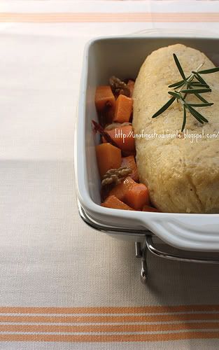 Quando le due preparazioni sono pronte, attendere che il polpettone si freddi un po’ (quando è ancora caldo è più fragile e si potrebbe rompere), liberarlo delicatamente dalla carta e adagiarlo nella teglia dove è stata cotta la zucca. Prima di servire, aggiungere i pomodori secchi dissalati e tagliati a julienne, i gherigli di noci e scaldare. Buon appetito.